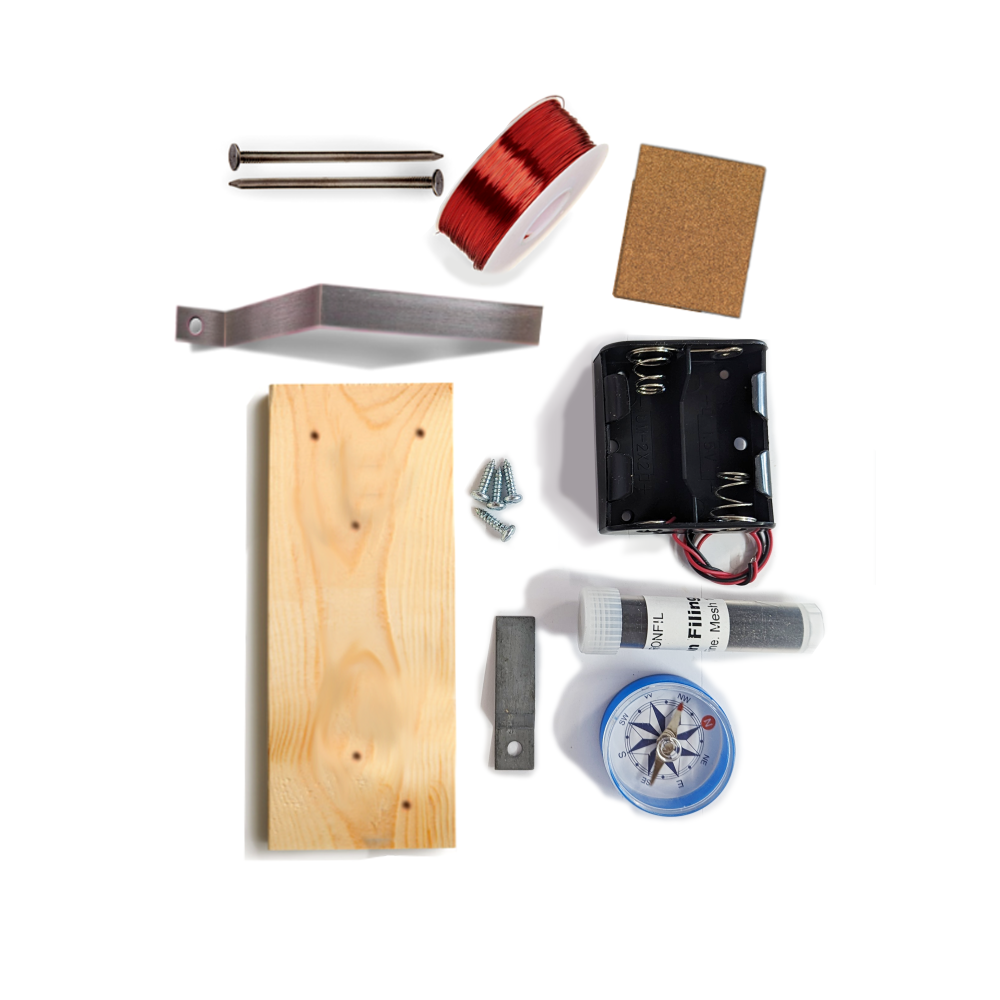 Material Basic Level Advanced Level Enameled Copper Wire (Magnet Wire 28 AWG) Spool of 100 feet Spool of 200 feet Battery Holder 1 Battery Holder for 2 C size cells 3 Battery Holders for 2 C size cells Large Nail 1 Nail (10d 3") 4 Nails (10d 3") Iron Filings 1 Small Bag or Bottle 1 Small Bag or Bottle Wood Block 1 Wood Block (150 x 62mm) 3 Wood Blocks (150 x 62mm) Key Strip 1 Key: metal strip (50 x 12mm) 8 Key: metal strip (50 x 12mm) Armature 1 Large Z-shaped metal strip (150mm x 12mm) 3 Large Z-shaped metal strips (150mm x 12mm) Magnetic Compass 1 Magnetic Compass 1 Magnetic Compass Sandpaper 1 Sandpaper (5 cm x 7 cm) 1 Sandpaper (5 cm x 7 cm) Screws 4 Screws 20 Screws Steel Shapes - 1 Bottle Steel Shapes (Polished Iron pieces) Disk Magnets - 6 Disk Magnets Neodymium Magnet - 1 Neodymium Magnet (Super magnet) Latch Magnets - 2 Latch Magnets Wires - 2 Insulated Wires and 1 bare wire