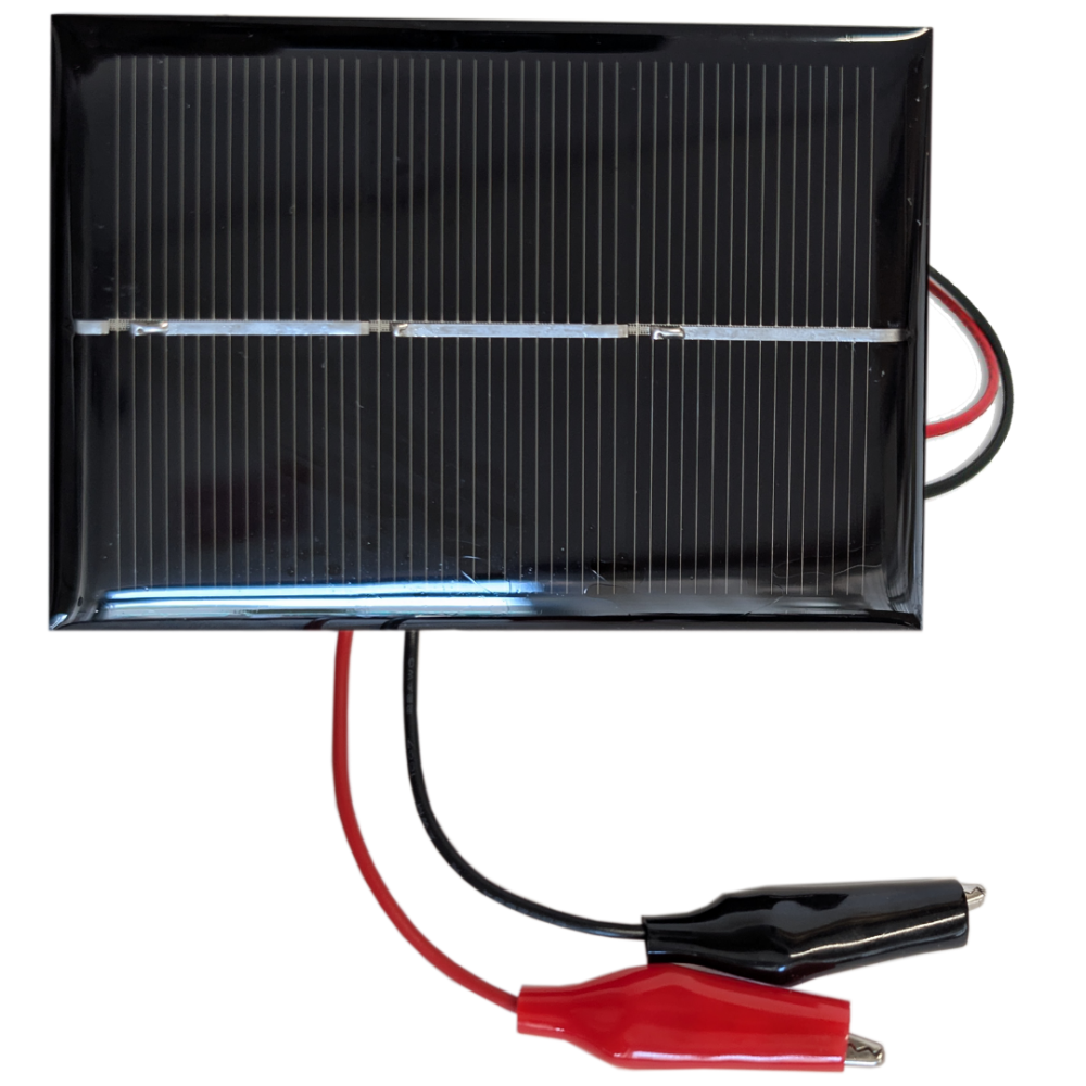 Output Power 0.6 W (600 mW) under STC (1000 W/m², AM 1.5, 25 °C) Typical Voltage ~1.5–2.0 V under load (open-circuit voltage ~2.2–2.5 V) Typical Current ~300–400 mA depending on sunlight and load Dimensions 60 mm × 80 mm Encapsulation Epoxy-coated surface for durability and handling protection Leads 22.5 cm insulated wires with alligator clips Connector Type Mini alligator clips for quick, tool-free attachment